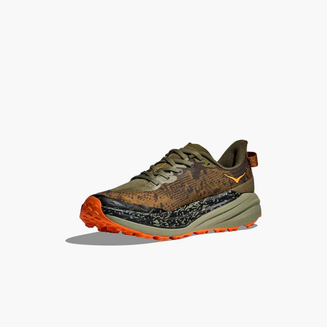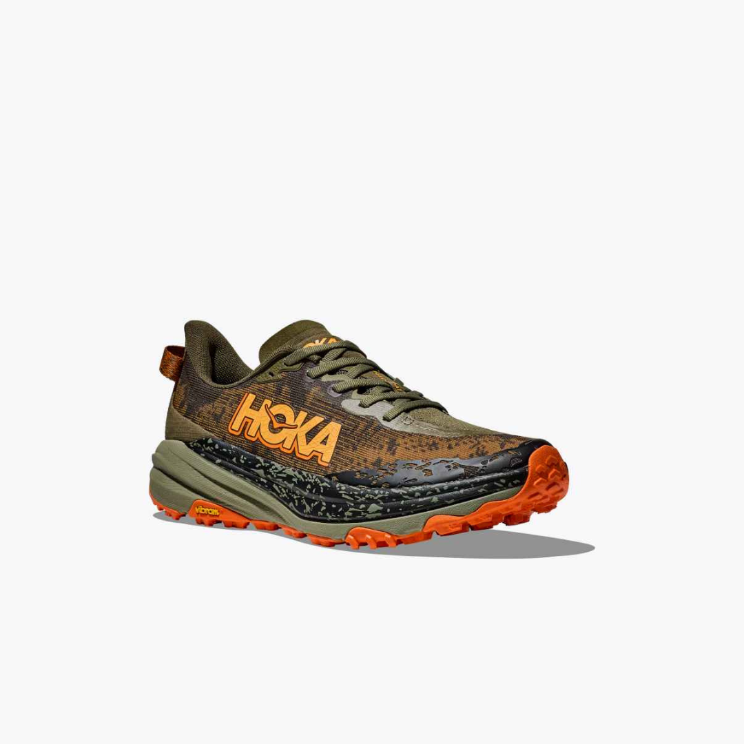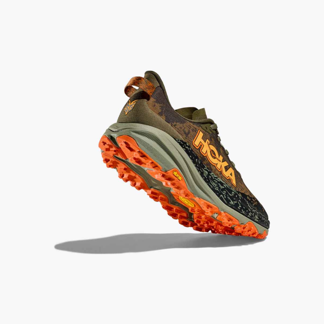 A workhorse designed for technical trails, the Speedgoat returns with less weight and more traction than ever before. A new shoe from outsole to laces, this trail beast is updated with Vibram® Megagrip with Traction Lug for enhanced grip on loose soil. Retaining the same stack height and rocker profile, the Speedgoat 5 employs a lighter midsole compound and heartier, double layer jacquard mesh to inspire confidence on any terrain.
